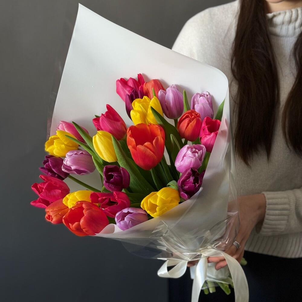 Тюльпаны символизируют весну и обновление, а их яркие оттенки — от нежно-розового до ярко-красного и солнечно-желтого — добавят ярких красок в любой интерьер. Букет аккуратно оформлен и готов стать прекрасным подарком, который не оставит равнодушным ни одного получателя.